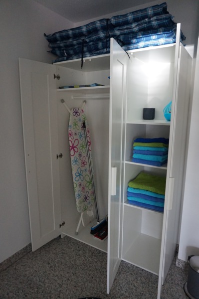 hier befinden sich die Handtücher (pP. 1 x Duschhandtuch und 1 x kleineres Handtuch diese sind nur im Haus zu benutzen, Badetücher müssen extra mitgebracht werden!), Bügelbrett und -eisen, Wäscheständer und Klammern, Besen, Kehrschaufel, Wischmop, Tischdecke für Terrassentisch und die Sitzpolster für die Terrassenstühle